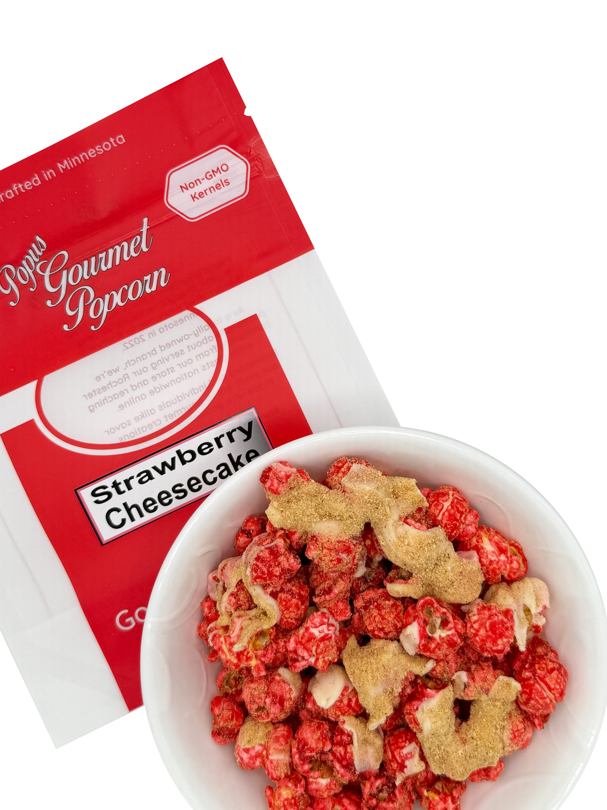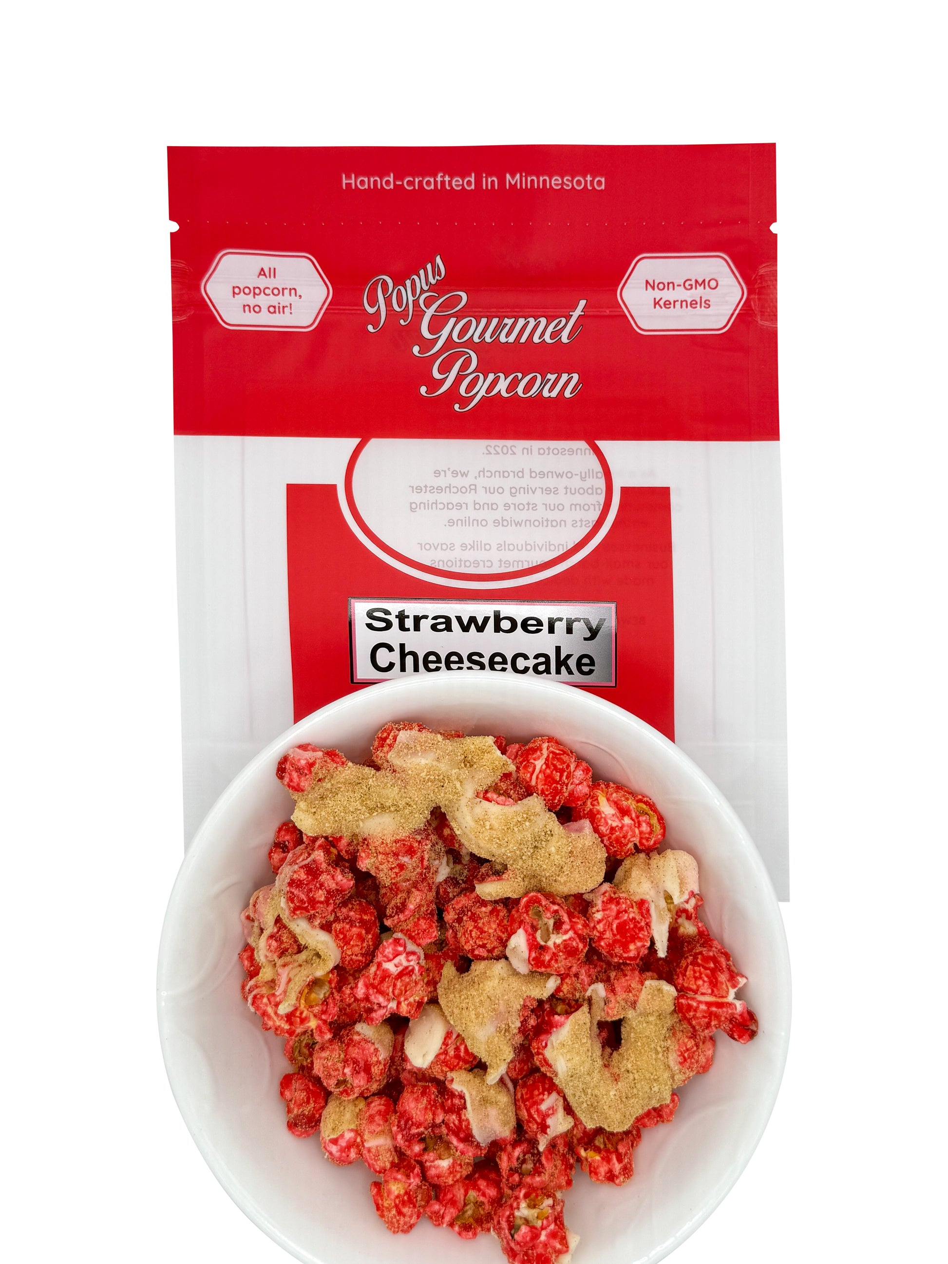 A decadent twist on a classic dessert! Sweet strawberry popcorn is drizzled with creamy white chocolate and topped with crushed graham crackers for the perfect balance of fruity, rich, and buttery flavors. Every bite delivers the irresistible taste of strawberry cheesecake in a light, crunchy treat!